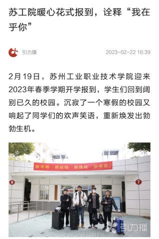 2月19日,蘇州工業(yè)職業(yè)技術學院迎來2023年春季學期開學報到,學生們回到闊別已久的校園。沉寂了一個寒假的校園又響起了同學們的歡聲笑語,重新煥發(fā)出勃勃生機。