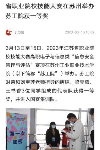 3月13日至15日,2023年江蘇省職業院校技能大賽高職電子與信息類“信息安全管理與評估”賽項在蘇州工業職業技術學院(以下簡稱“蘇工院”)舉辦。蘇工院時榮和劉寶蓮老師指導的唐錦、梁夢茹、王書香3位同學組成的代表隊獲得一等獎,并進入國賽集訓隊。