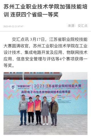 交匯點(diǎn)訊 3月17日,江蘇省職業(yè)院校技能大賽圓滿收官,蘇州工業(yè)職業(yè)技術(shù)學(xué)院在工業(yè)設(shè)計(jì)技術(shù)、集成電路開(kāi)發(fā)及應(yīng)用、物聯(lián)網(wǎng)技術(shù)應(yīng)用、信息安全管理與評(píng)估等4個(gè)賽項(xiàng)獲得一等獎(jiǎng)。