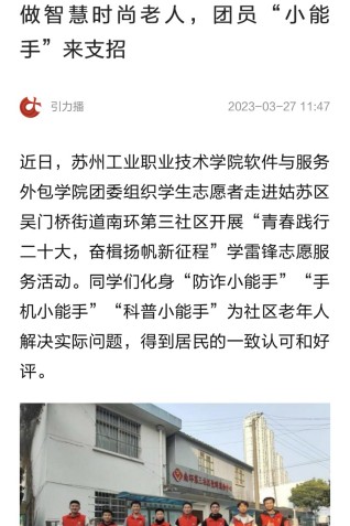 近日,蘇州工業職業技術學院軟件與服務外包學院團委組織學生志愿者走進姑蘇區吳門橋街道南環第三社區開展“青春踐行二十大,奮楫揚帆新征程”學雷鋒志愿服務活動。同學們化身“防詐小能手”“手機小能手”“科普小能手”為社區老年人解決實際問題,得到居民的一致認可和好評。
