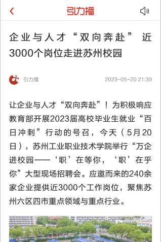 蘇工院學生工作部部長童鈺祥介紹,為了促進2023屆畢業生高質量就業,學校上下齊心,全員聯動。學校領導聚焦當前就業工作重點難點,開展書記校長訪企拓崗促就業行動;學工處加強與蘇州六區四市的人力資源社會保障部門溝通聯系,邀請企業進校園招賢納才;各系(院)深入開展校企合作,拓展用人單位和崗位。(蘇報融媒記者 袁藝)