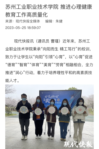 現代快報訊(通訊員 曹瑾)近年來,蘇州工業職業技術學院秉承“向陽而生 精工篤行”的校訓,致力于讓學生以“向陽”引領“心育”,以“心育”促進“德育”“智育”“體育”“美育”“勞育”相融相合,全力推進“潤心”行動,著力于培養理性平和的高素質技能人才。