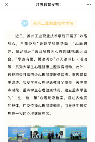 近日,蘇州工業職業技術學院開展了“妙筆繪心,自我悅納”曼陀羅繪畫活動、“心向陽光,悅動悅樂”第四屆校園心理趣味挑戰運動會、“學貴有恒,悅讀潤心”21天讀書打卡活動等一系列大學生心理健康主題教育活動。此外,該校積極打造四級心理健康服務網絡;重視課堂主渠道,實現學生心理健康教育全覆蓋;關注重點時段、重點學生心理健康情況,建立重點學生的“一生一檔一策”心理動態檔案。通過多維度的載體,廣泛傳播心理健康知識,引導學生樹立理性平和的心理健康理念。