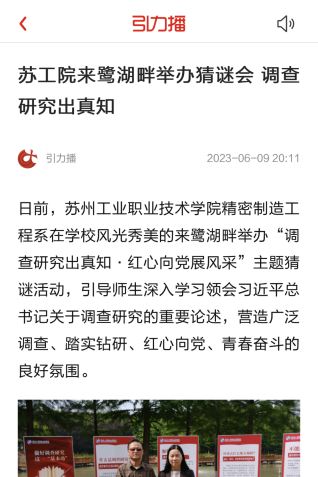 日前,蘇州工業職業技術學院精密制造工程系在學校風光秀美的來鷺湖畔舉辦“調查研究出真知·紅心向黨展風采”主題猜謎活動,引導師生深入學習領會習近平總書記關于調查研究的重要論述,營造廣泛調查、踏實鉆研、紅心向黨、青春奮斗的良好氛圍。