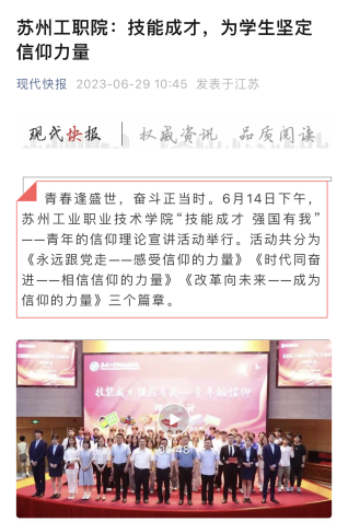 青春逢盛世,奮斗正當時。6月14日下午,蘇州工業職業技術學院“技能成才 強國有我”——青年的信仰理論宣講活動舉行。活動共分為《永遠跟黨走——感受信仰的力量》《時代同奮進——相信信仰的力量》《改革向未來——成為信仰的力量》三個篇章。