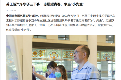 中國青年網蘇州8月16日電(通訊員 湯岐遠)2023年7月4日,蘇州工業職業技術學院汽車工程系志愿耀青春爭當小先生進社區進醫院團隊20余名學生志愿者作為“小先生”,走進蘇州市吳中區城南街道家天下社區、蘇州市明基醫院開展暑期志愿服務活動,做服務社會、體察民情的“小老師”。