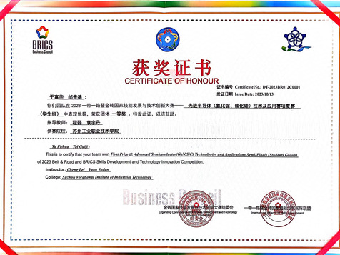 10月10日——13日,2023一帶一路暨金磚國家技能發(fā)展與技術(shù)創(chuàng)新大賽先進(jìn)半導(dǎo)體(氮化鎵、碳化硅)技術(shù)及應(yīng)用賽項(xiàng)復(fù)賽在浙江省海寧市鵑湖科技城電子科技創(chuàng)新園舉行。由程磊、袁宇丹老師指導(dǎo)的于富華、邰貴基學(xué)生團(tuán)隊(duì)在比賽中獲得了一等獎第一名的好成績。