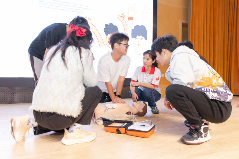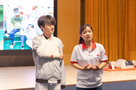 活動開始,韓永健圍繞“紅氣球挑戰賽”項目介紹、蘇州站賽事安排、公益項目介紹三方面進行了培訓。潘丹丹和王蘇閩主要講解了江蘇省紅十字條例等法規和應急救護相關知識,重點普及心肺復蘇、氣道異物梗阻、自救互救等必要安全知識,還就“止血、包扎、固定、搬運”創傷急救四大技術進行了詳細介紹。為了讓大家更好理解急救知識、體驗急救環節,培訓教師現場邀請同學進行一對一教學演示講解,工作人員對過程中同學們提出的問題逐個解答,同學們根據自己的實際經驗積極學習應急急救知識。演示結束后,各參賽隊伍在志愿者和蘇州市紅十字會老師的指導下,以“情景模擬+互動體驗”的方式依次上場練習,進行了心肺復蘇技術實操訓練,環形包扎、螺旋包扎等繃帶包扎現場演示,為后期比賽和應急救助做好充分的知識儲備和實踐準備。