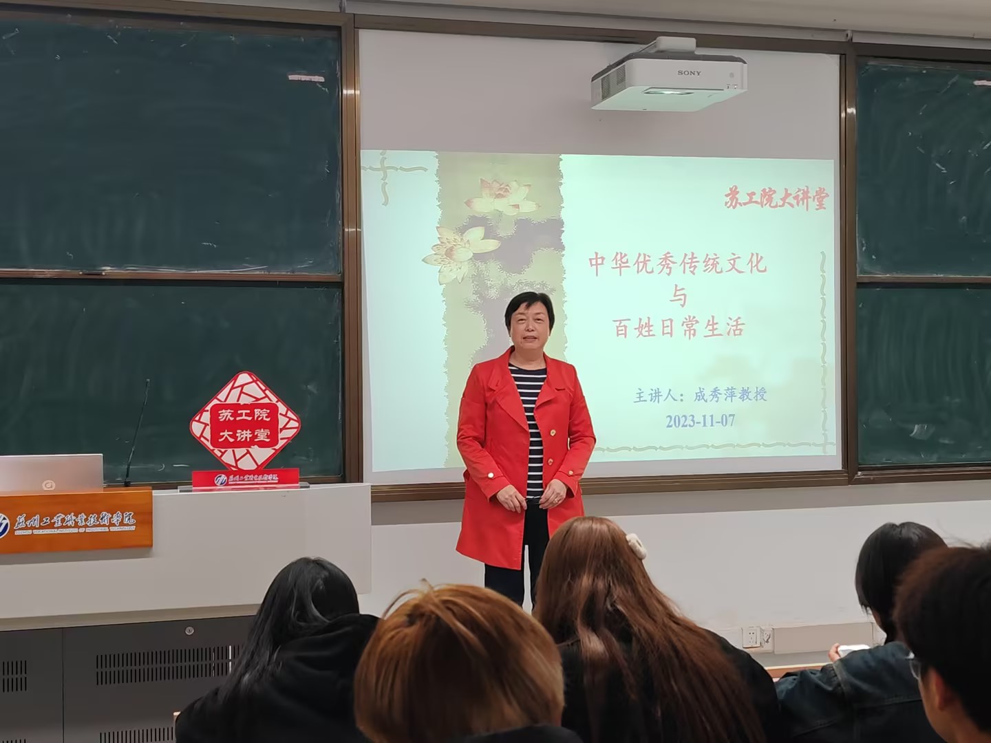 11月7日晚,馬克思主義學(xué)院教授成秀萍在天鐸樓階梯教室BL05給建藝系師生開(kāi)展蘇工院大講堂——“中華優(yōu)秀傳統(tǒng)文化與百姓日常生活”主題講座,建藝系黨總支副書(shū)記王宛平、輔導(dǎo)員張祥、23級(jí)相關(guān)專業(yè)學(xué)生、悅讀社成員聆聽(tīng)講座。