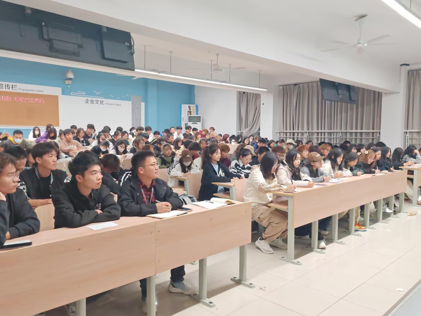 成秀萍從中華優(yōu)秀傳統(tǒng)文化的內(nèi)涵、走出國(guó)門(mén)的情況、與百姓的日常生活、與建藝系學(xué)生的實(shí)習(xí)就業(yè)等方面展開(kāi)講述,不僅為學(xué)生們帶來(lái)了生動(dòng)有趣的“古人解壓八招”,讓他們更加了解中華優(yōu)秀傳統(tǒng)文化,提高了專業(yè)認(rèn)知水平,同時(shí)她也為學(xué)生們未來(lái)的實(shí)習(xí)、就業(yè)提供了方向性指導(dǎo)。成秀萍希望學(xué)生們能提前做好學(xué)業(yè)規(guī)劃、職業(yè)規(guī)劃,堅(jiān)定努力刻苦學(xué)習(xí)的決心。講座現(xiàn)場(chǎng),座無(wú)虛席,師生們積極思考,齊聲朗誦古詩(shī),認(rèn)真做筆記,踴躍回答問(wèn)題,學(xué)習(xí)氛圍濃厚。