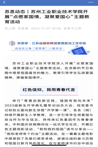 蘇州工業職業技術學院堅持以習近平新時代中國特色社會主義思想為指導,將愛國主義教育貫穿立德樹人全過程,依托“一站式”學生社區,立足于學生成長成才關鍵時間點,教育引導學生以愛國主義為青春靚麗底色,做有大愛大德大情懷的時代新人。