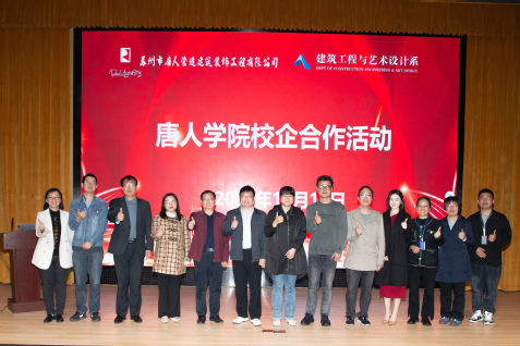 為促進(jìn)產(chǎn)學(xué)研緊密結(jié)合,加強(qiáng)人才培養(yǎng)與專業(yè)發(fā)展的深度融合,11月10日下午,建藝系在叢薈廳開展唐人學(xué)院校企合作活動。蘇州市唐人營造建筑裝飾工程有限公司總經(jīng)理戴衛(wèi)忠、副總經(jīng)理翁坤元、行政專員張燕,建藝系黨總支書記李明、系主任王迪、系黨總支副書記王宛平、系副主任田建冬、學(xué)校對外交流與校企合作處副處長劉向、唐人冠名班班主任徐杰、建工教研室主任張賀鵬、2023級全體學(xué)生與2022級、2021級唐人獎學(xué)金獲獎學(xué)生代表出席本次活動。