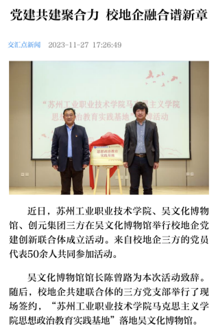 近日,蘇州工業職業技術學院、吳文化博物館、創元集團三方在吳文化博物館舉行校地企黨建創新聯合體成立活動。來自校地企三方的黨員代表50余人共同參加活動。