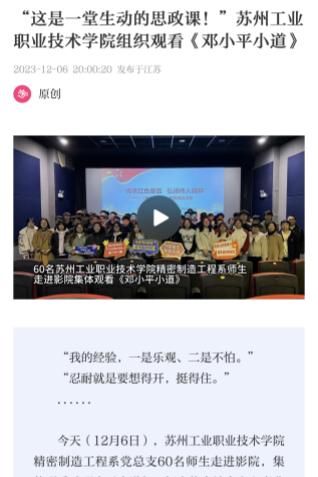 今天(12月6日),蘇州工業職業技術學院精密制造工程系黨總支60名師生走進影院,集體觀看《鄧小平小道》,切實體會社會主義事業和前輩開拓者所付出的艱辛,并從中汲取不斷奮勇前進的力量。