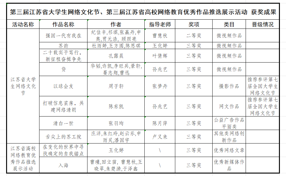 近日,江蘇省教育廳公布了第三屆江蘇省大學生網絡文化節和高校網絡教育優秀作品推選展示活動遴選結果。我校師生10項作品在此次活動中獲獎,其中2項學生作品首次晉級,被省教育廳推薦參加第七屆全國大學生網絡文化節復賽評選。