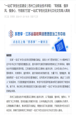 蘇州工業職業技術學院落實立德樹人根本任務,以“筑根基、強學風、強身心、守底線”為工作思路,堅持加強以黨建為引領,以學風建設為主線,以強基潤心為抓手,以增強意識為重點,推動校園文化建設,增強社區文化浸潤度,開展各類學生社區文化活動,探索打造具有蘇工特色的“一站式”學生社區多元文化交互育人高地。