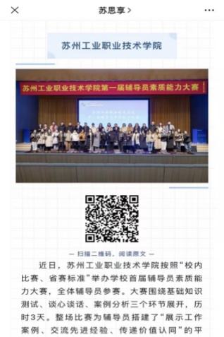 近日,蘇州工業(yè)職業(yè)技術(shù)學(xué)院按照“校內(nèi)比賽、省賽標準”舉辦學(xué)校首屆輔導(dǎo)員素質(zhì)能力大賽,全體輔導(dǎo)員參賽。大賽圍繞基礎(chǔ)知識測試、談心談話、案例分析三個環(huán)節(jié)展開,歷時3天。整場比賽為輔導(dǎo)員搭建了“展示工作案例、交流先進經(jīng)驗、傳遞價值認同”的平臺,通過以賽促學(xué)、以賽提能,提升了輔導(dǎo)員自身的理論水平、職業(yè)能力和專業(yè)素養(yǎng),促進了輔導(dǎo)員向職業(yè)化、專業(yè)化、專家化方向發(fā)展。