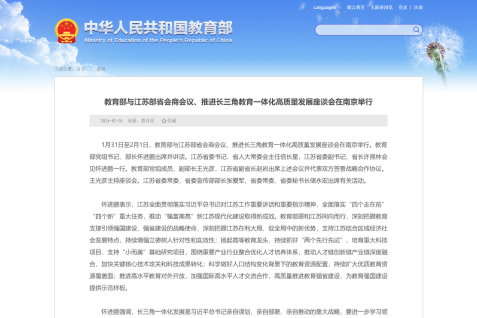 1月31日至2月1日,教育部與江蘇部省會商會議、推進長三角教育一體化高質量發展座談會在南京舉行。教育部黨組書記、部長懷進鵬出席并講話。江蘇省委書記、省人大常委會主任信長星,江蘇省委副書記、省長許昆林會見懷進鵬一行。教育部黨組成員、副部長王光彥,江蘇省副省長趙巖出席上述會議并代表雙方簽署戰略合作協議。王光彥主持座談會。江蘇省委常委、省委宣傳部部長張愛軍,省委常委、省委秘書長儲永宏出席有關活動。