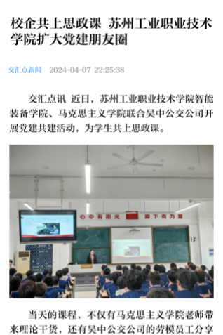 交匯點訊 近日,蘇州工業職業技術學院智能裝備學院、馬克思主義學院聯合吳中公交公司開展黨建共建活動,為學生共上思政課。