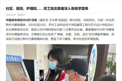 中國青年網蘇州4月7日電(通訊員 王化婷 錢蕊蕊)微光成炬,向陽而生。為進一步弘揚新時代雷鋒精神,3月9日至30日,蘇州工業職業技術學院建筑工程與藝術設計學院共80名志愿者前往社區、醫院以及護理院等地開展“三月春風處處暖,雷鋒精神代代傳”學雷鋒系列志愿服務活動。志愿者們充分發揚了“奉獻、友愛、互助、進步”的志愿服務精神,用實際行動踐行新時代雷鋒精神內涵,營造了學習雷鋒,爭當先進的濃厚氛圍。