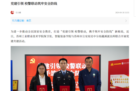 為進一步推動全民國家安全教育,打造“黨建引領 校警聯動,攜手筑牢安全防線”新格局,近日,蘇州工業職業技術學院保衛處、智能裝備學院與蘇州市公安局吳中分局越溪派出所聯合開展黨建共建活動。