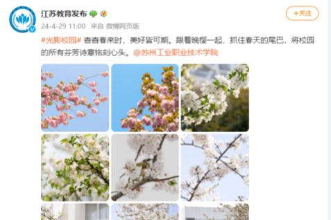 #光影校園# 杳杳春來時,美好皆可期。跟著晚櫻一起,抓住春天的尾巴,將校園的所有芬芳詩意銘刻心頭。@蘇州工業職業技術學院 https://weibo.com/3674007143/5028450976925613?sourceType=weixin&from=10E4395060&wm=9006_2001&featurecode=newtitle&s_channel=4&s_trans=5178800881_5028450976925613(江蘇教育發布微博 24.4.29)