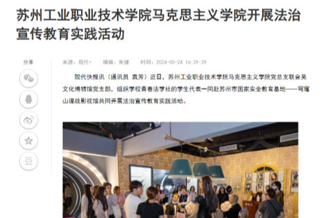 現(xiàn)代快報(bào)訊(通訊員 袁芳)近日,蘇州工業(yè)職業(yè)技術(shù)學(xué)院馬克思主義學(xué)院黨總支聯(lián)合吳文化博物館黨支部,組織學(xué)校青春法學(xué)社的學(xué)生代表一同赴蘇州市國(guó)家安全教育基地——穹窿山諜戰(zhàn)影視館共同開展法治宣傳教育實(shí)踐活動(dòng)。