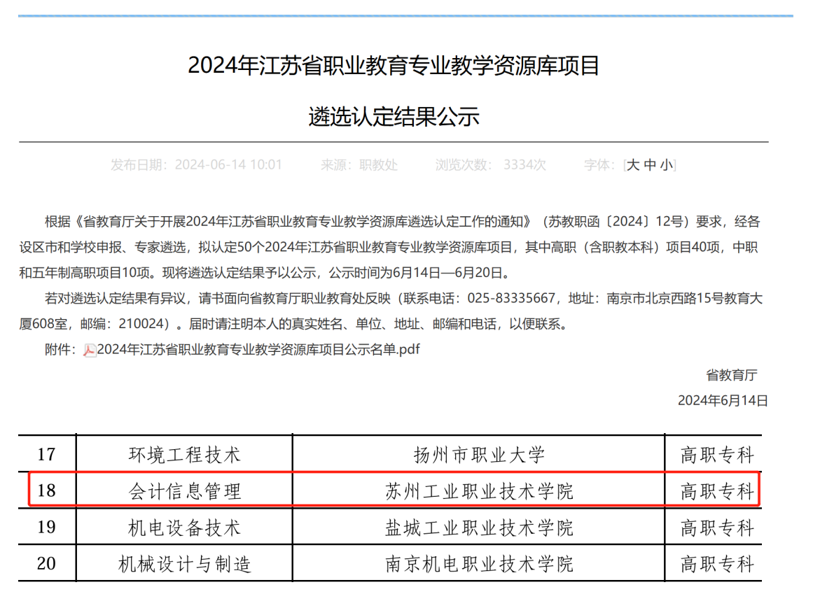 近日,江蘇省教育廳發布《2024年江蘇省職業教育專業教學資源庫項目遴選認定結果公示》,認定50個2024年江蘇省職業教育專業教學資源庫項目,其中高職(含職教本科)項目40項。我校經濟管理學院的“會計信息管理專業教學資源庫”獲批立項建設。
