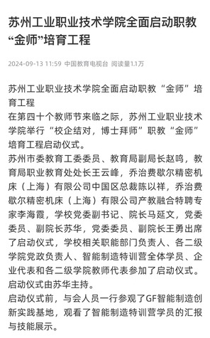 長期以來,蘇州工業職業技術學院高度重視師資隊伍建設,如何結合高職教育特點,弘揚教育家精神時代內涵,是學校在教師培養中一直關注和發力的關鍵點。今年暑假,學校聯合GF公司開設了智能制造特訓營,啟動了職教“金師”培育工程。