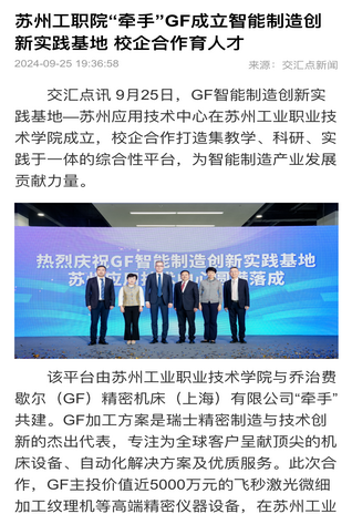 交匯點(diǎn)訊 9月25日,GF智能制造創(chuàng)新實(shí)踐基地—蘇州應(yīng)用技術(shù)中心在蘇州工業(yè)職業(yè)技術(shù)學(xué)院成立,校企合作打造集教學(xué)、科研、實(shí)踐于一體的綜合性平臺(tái),為智能制造產(chǎn)業(yè)發(fā)展貢獻(xiàn)力量。