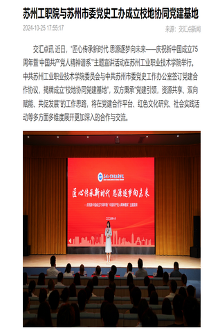 近日,“匠心傳承新時代 思源逐夢向未來——慶祝新中國成立75周年暨‘中國共產黨人精神譜系’”主題宣講活動在蘇州工業職業技術學院舉行。中共蘇州工業職業技術學院委員會與中共蘇州市委黨史工作辦公室簽訂黨建合作協議,揭牌成立“校地協同黨建基地”,雙方秉承“黨建引領,資源共享、雙向賦能、共促發展”的工作思路,將在黨建合作平臺、紅色文化研究、社會實踐活動等多方面多維度展開更加深入的合作與交流。
