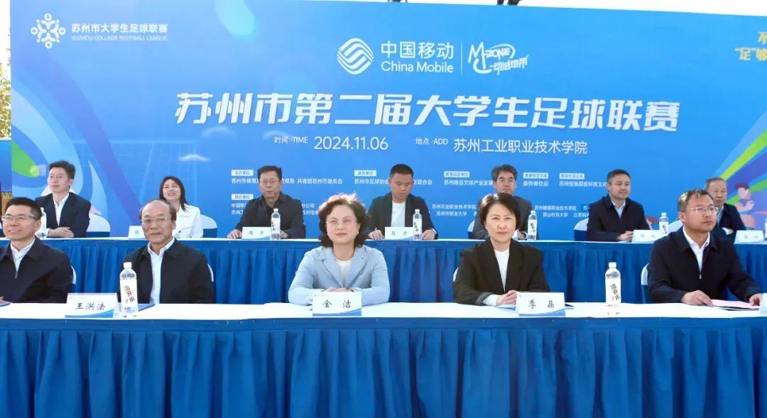 11月6日下午,蘇州市第二屆大學生足球聯賽在我校拉開戰幕。蘇州市委常委、宣傳部長金潔,蘇州市人民政府副市長季晶、蘇州市委副秘書長韋國嶺,江蘇省足球運動協會副主席、黨支部書記王小灣,市體育局、市教育局、市團市委主要負責同志及參賽學校相關領導參加開幕式并觀看揭幕戰比賽。我校黨委書記王洪法、院長馬延文參加。活動由中央電視臺體育頻道主持人王濤主持。