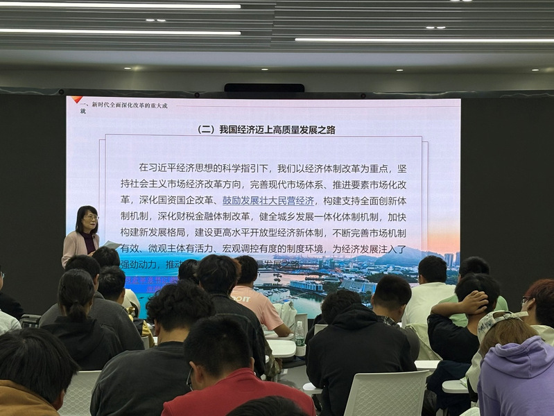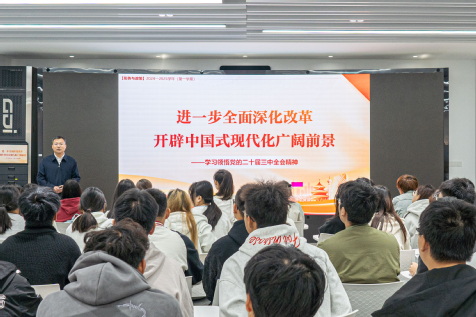 學(xué)校黨委副書記、院長馬延文為營銷24C1班、營銷24D1班學(xué)生授課。他從改革開放的前沿陣地蘇州談起,引導(dǎo)學(xué)生們深刻認(rèn)識新時代全面深化改革取得的重大實(shí)踐成果、制度成果、理論成果。在談到教育領(lǐng)域時,他指出,黨的二十屆三中全會提出“教育、科技、人才是中國式現(xiàn)代化的基礎(chǔ)性、戰(zhàn)略性支撐”,激勵學(xué)生們要腳踏實(shí)地、增長才干,向高素質(zhì)技術(shù)技能人才看齊。