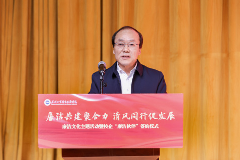 學(xué)校黨委書記王洪法在致辭中對出席活動的市紀(jì)委監(jiān)委領(lǐng)導(dǎo)和書香酒店集團(tuán)領(lǐng)導(dǎo)表示誠摯歡迎,對市紀(jì)委監(jiān)委領(lǐng)導(dǎo)和書香酒店集團(tuán)領(lǐng)導(dǎo)給予學(xué)校事業(yè)發(fā)展的支持幫助表示衷心感謝。他指出,加強(qiáng)新時代廉潔文化建設(shè)是我們黨勇于自我革命、保持先進(jìn)性和純潔性、在全社會樹立廉潔價值理念的重要舉措。學(xué)校黨委始終堅持思想引領(lǐng),夯實(shí)清正廉潔思想根基;始終堅持貫通融合,構(gòu)建多元廉潔育人體系;始終堅持守正創(chuàng)新,推動廉潔文化在校園落地生根。希望今后與蘇州書香酒店集團(tuán)攜手聚力,通過高質(zhì)量黨建助力校企合作,充分發(fā)揮雙方資源優(yōu)勢,以“共建”促“共廉”,以“共廉”促“共贏”,助推校企合作邁向更深更廣領(lǐng)域。
