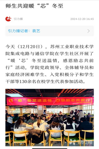 今天(12月20日),蘇州工業職業技術學院集成電路與通信學院在學生社區開展了“暖‘芯’冬至送溫情,感恩勵志共前行”活動,學院黨政領導、全體輔導員和家庭經濟困難學生、入黨積極分子和學生干部等130余名在校學生代表參加活動。