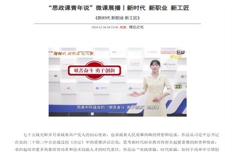 七十五載光輝歲月承載著共產(chǎn)黨人的初心使命,也承載著人民勇攀高峰的理想和追求。作品從習(xí)近平總書記在黨的二十屆三中全會(huì)通過(guò)的《決定》中的重要講話出發(fā),思考新時(shí)代職業(yè)教育將肩負(fù)起更重要的職責(zé)和使命,承擔(dān)起培養(yǎng)更多高素質(zhì)勞動(dòng)者和技術(shù)技能人才的時(shí)代重任。作品由“實(shí)踐續(xù)篇,時(shí)代新篇,如何于改革中引領(lǐng)創(chuàng)新”、“工匠精神,人人出彩,怎樣在堅(jiān)守中追求卓越”、“匠心逐夢(mèng),強(qiáng)國(guó)有我,于平凡中彰顯不凡,青年當(dāng)何為”三個(gè)部分構(gòu)成,通過(guò)中國(guó)天眼之父南仁東、大國(guó)工匠洪家光及我校優(yōu)秀畢業(yè)生蔡飛揚(yáng)的故事,引導(dǎo)廣大青年學(xué)子思考如何堅(jiān)定理想信念、厚植精神之力;如何堅(jiān)持知行合一、弘揚(yáng)工匠精神;如何勇?lián)鷷r(shí)代重任,在技能報(bào)國(guó)的舞臺(tái)上大展青云之志?最后呼吁青年學(xué)子:新業(yè)態(tài)催生新職業(yè),新職業(yè)呼喚新工匠,職業(yè)教育承擔(dān)著更為重要的歷史使命。同時(shí),它也是我們每一位同學(xué)逐夢(mèng)、筑夢(mèng)、圓夢(mèng)的舞臺(tái),我們要勇?lián)鷷r(shí)代重任,傳承工匠精神,在技能報(bào)國(guó)的舞臺(tái)上大展風(fēng)采,展現(xiàn)新時(shí)代的新?lián)?dāng),書寫新時(shí)代的新作為!