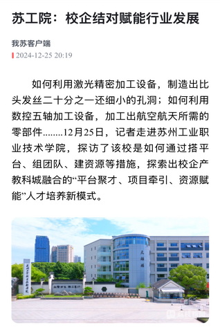 如何利用激光精密加工設備,制造出比頭發絲二十分之一還細小的孔洞;如何利用數控五軸加工設備,加工出航空航天所需的零部件........12月25日,記者走進蘇州工業職業技術學院,探訪了該校是如何通過搭平臺、組團隊、建資源等措施,探索出校企產教科城融合的“平臺聚才、項目牽引、資源賦能”人才培養新模式。