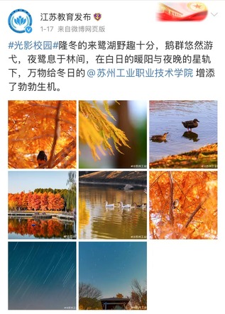 #光影校園#隆冬的來鷺湖野趣十分,鵝群悠然游弋,夜鷺息于林間,在白日的暖陽與夜晚的星軌下,萬物給冬日的@蘇州工業職業技術學院 增添了勃勃生機。