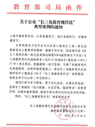近日,教育部發展規劃司、長三角教育現代化檢測評估領導小組辦公室公布了《關于公布“長三角教育現代化”典型案例》的通知,我校《跨區聯動,助推長三角智能制造“三教”改革》案例入選。