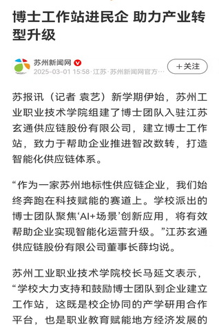 蘇報訊(記者 袁藝)新學期伊始,蘇州工業職業技術學院組建了博士團隊入駐江蘇玄通供應鏈股份有限公司,建立博士工作站,致力于幫助企業推進智改數轉,打造智能化供應鏈體系。