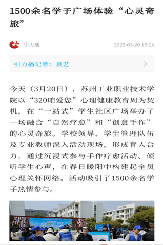 蘇州工業職業技術學院始終將學生心理健康教育工作置于重要位置,堅持以“五育并舉”厚植成長沃土,以“三全育人”織密關愛網絡,全方位護航學生心理健康,助力培育德才兼備、身心俱佳的時代新人,讓青春在陽光雨露中蓬勃綻放。(蘇報融媒記者 袁藝 通訊員 王曉燕/文/圖)