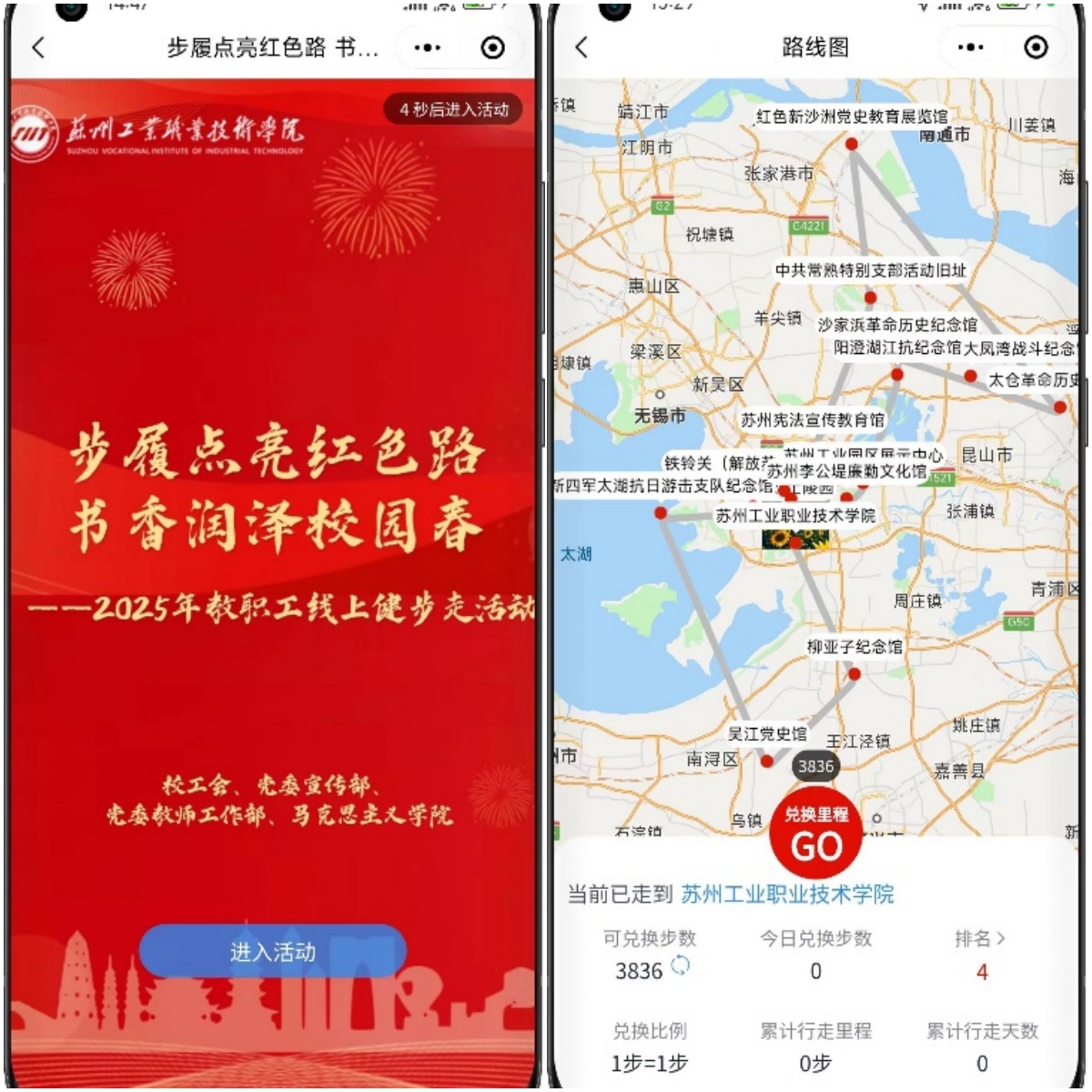 活動旨在倡導健康文明的生活方式,鼓勵教職工加強日常鍛煉、強身健體。通過線下運動、線上學習的方式,選擇17個具有蘇州特色的場地作為活動打卡點。在介紹打卡點相關知識的同時還專門推薦了一批紅色書籍,教育引導全校教職員工在行走中感悟初心,在書香中汲取力量,共同銘記革命歷史,傳承紅色基因,營造凝心聚力、團結奮進的干事創(chuàng)業(yè)氛圍。