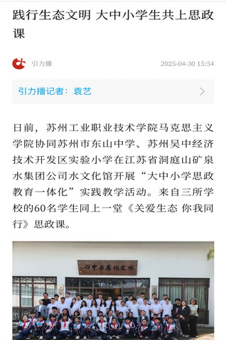 日前,蘇州工業職業技術學院馬克思主義學院協同蘇州市東山中學、蘇州吳中經濟技術開發區實驗小學在江蘇省洞庭山礦泉水集團公司水文化館開展“大中小學思政教育一體化”實踐教學活動。來自三所學校的60名學生同上一堂《關愛生態 你我同行》思政課。