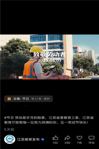 #節(jié)日 勞動是歲月的勛章,江蘇省委教育工委、江蘇省教育廳致敬每一位努力拼搏的你,五一勞動節(jié)快樂!原視頻請至“江蘇教育發(fā)布”視頻號觀看。(江蘇教育發(fā)布 25.05.01)