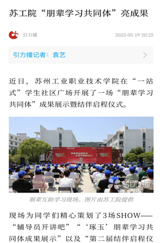 近日,蘇州工業職業技術學院在“一站式”學生社區廣場開展了一場“朋輩學習共同體”成果展示暨結伴啟程儀式。
