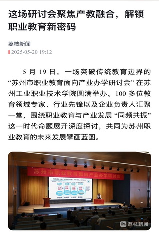 5月19日,一場(chǎng)突破傳統(tǒng)教育邊界的 “蘇州市職業(yè)教育面向產(chǎn)業(yè)辦學(xué)研討會(huì)” 在蘇州工業(yè)職業(yè)技術(shù)學(xué)院圓滿舉辦。100 多位教育領(lǐng)域?qū)<摇⑿袠I(yè)先鋒以及企業(yè)負(fù)責(zé)人匯聚一堂,圍繞職業(yè)教育與產(chǎn)業(yè)發(fā)展 “同頻共振” 這一時(shí)代命題展開深度探討,共同為蘇州職業(yè)教育的未來發(fā)展擘畫藍(lán)圖。