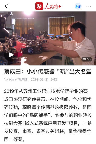 2019年從蘇州工業職業技術學院畢業的蔡成田熱衷研究傳感器。在校期間,他總和代碼較勁,琢磨每個傳感器的極限參數,是同學們眼中的“晶圓捕手”。他參與的職業院校技能大賽“嵌入式系統應用開發”項目,一路從校賽、市賽、省賽過關斬將,最終獲得全國一等獎。