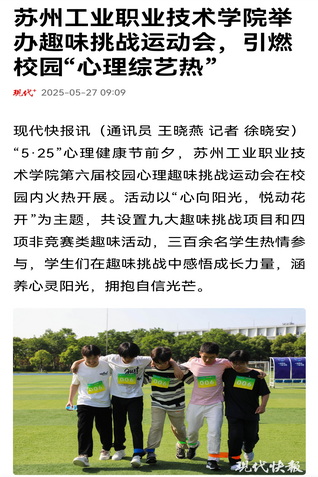 現代快報訊(通訊員 王曉燕 記者 徐曉安)“5·25”心理健康節前夕,蘇州工業職業技術學院第六屆校園心理趣味挑戰運動會在校園內火熱開展。活動以“心向陽光,悅動花開”為主題,共設置九大趣味挑戰項目和四項非競賽類趣味活動,三百余名學生熱情參與,學生們在趣味挑戰中感悟成長力量,涵養心靈陽光,擁抱自信光芒。