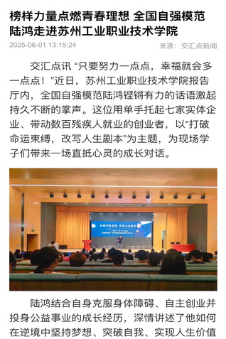 交匯點訊 “只要努力一點點,幸福就會多一點點!”近日,蘇州工業職業技術學院報告廳內,全國自強模范陸鴻鏗鏘有力的話語激起持久不斷的掌聲。這位用單手托起七家實體企業、帶動數百殘疾人就業的創業者,以“打破命運束縛,改寫人生劇本”為主題,為現場學子們帶來一場直抵心靈的成長對話。