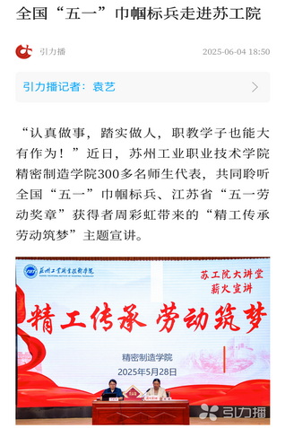 “認真做事,踏實做人,職教學子也能大有作為!”近日,蘇州工業職業技術學院精密制造學院300多名師生代表,共同聆聽全國“五一”巾幗標兵、江蘇省“五一勞動獎章”獲得者周彩虹帶來的“精工傳承 勞動筑夢”主題宣講。